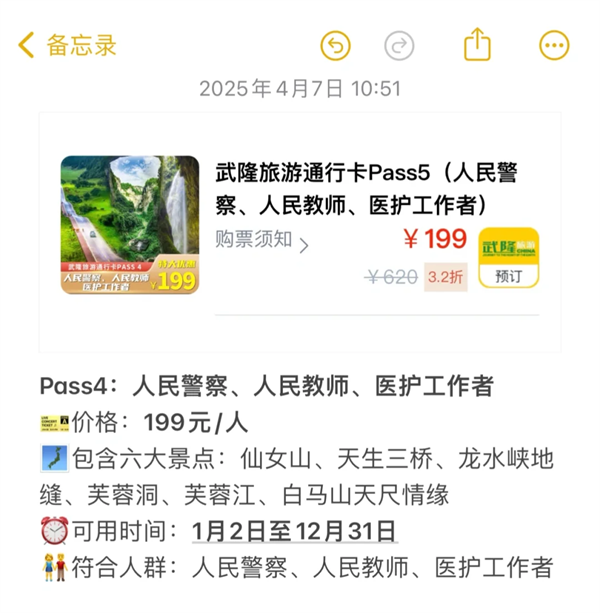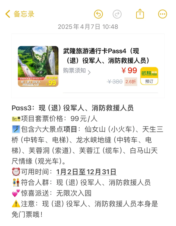 山东籍游客、人民教师、人民警察、医护人员、现(退)军人、消防人员注意啦!武隆为你们准备了专属套票。山东籍游客仅需99.9元,就能畅玩仙女山、天生三桥等六大景区;教师、警察、医护人员,花199元就能拿下包含门票、中转车、索道等在内的超值套票;现(退)役军人与消防救援人员,99元即可享受项目套票,在免门票基础上畅玩无忧 。这是武隆对你们的敬意与感谢。