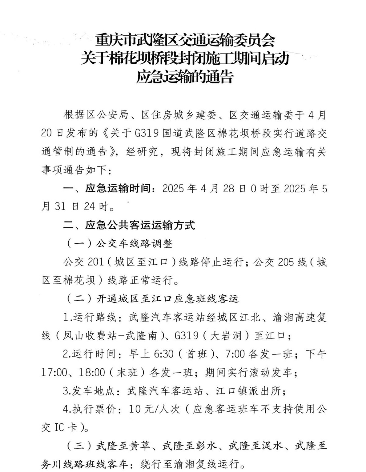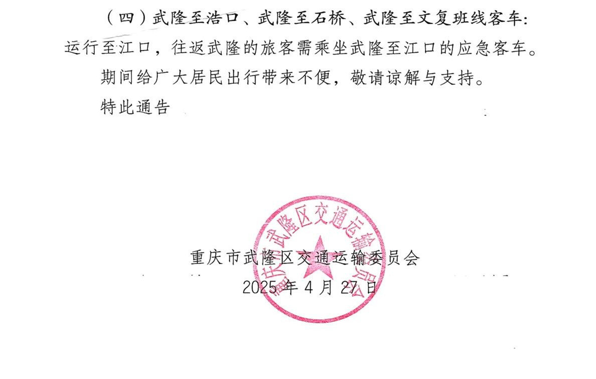 此外,为方便大家出行,武隆城区⇋江口镇(芙蓉洞、芙蓉江)应急客运班线已开通,途径城区江北、渝湘高速复线(凤山收费站·武隆南)、G319(大岩洞)至江口(芙蓉洞、芙蓉江景区)。