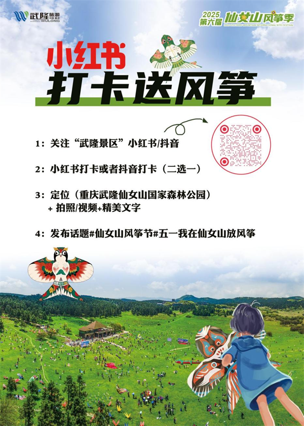 把春天放飞云端。仙女山化身“天空画布”,上演风筝与山峦共舞;您可通过拍照打卡、关注景区官方账号免费领取风筝,或在仙女山旧物换春天,用身边的矿泉水瓶、旧物兑换风筝;更有天空邮局浪漫上线——购买2只风筝即可在横幅上涂鸦寄语,让心愿乘风直上九霄!
