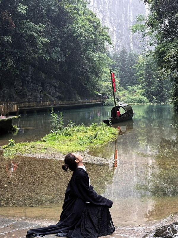 一秒穿越千年。踏入天生三桥龙泉洞,唐朝仕女乘乌篷船而来!只需完成打卡任务即可免费点曲,并在山水间感受“一曲唐音醉春风”的诗意。
