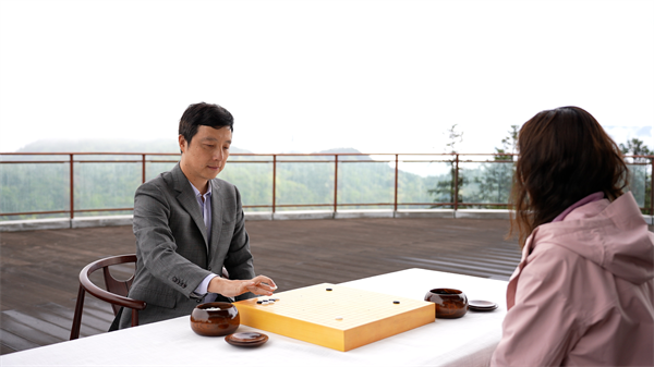 古力此行首站来到海拔1200米的白马山琴台茶寥。云雾缭绕间,他在观景台上展开了一场现实版 “神仙棋局”。面对180度的开阔观景视野,古力笑称这恰似围棋中的“大模样”布局。放眼望去,层层叠叠的茶山梯田在他眼中瞬间化作绿色棋盘,他不禁感慨:“原来武隆的绿水青山间,早已暗藏‘连环劫’的精妙。”