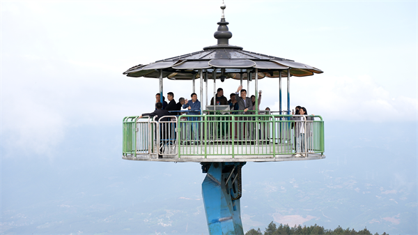 最令人心跳加速的体验,当属“飞天之吻”项目。两台位于海拔 1314 米的大型飞行岛,载着古力缓缓升至52 米高空,在悬崖之巅完成 “飞天之吻”。落地后的古力难掩激动,将此番体验比作围棋中的“长龙对杀”。当眼前白马王子与仙女造型的飞行岛交错,浪漫与刺激并存的景观尽收眼底,古力更是高呼:“白马山,5201314。”