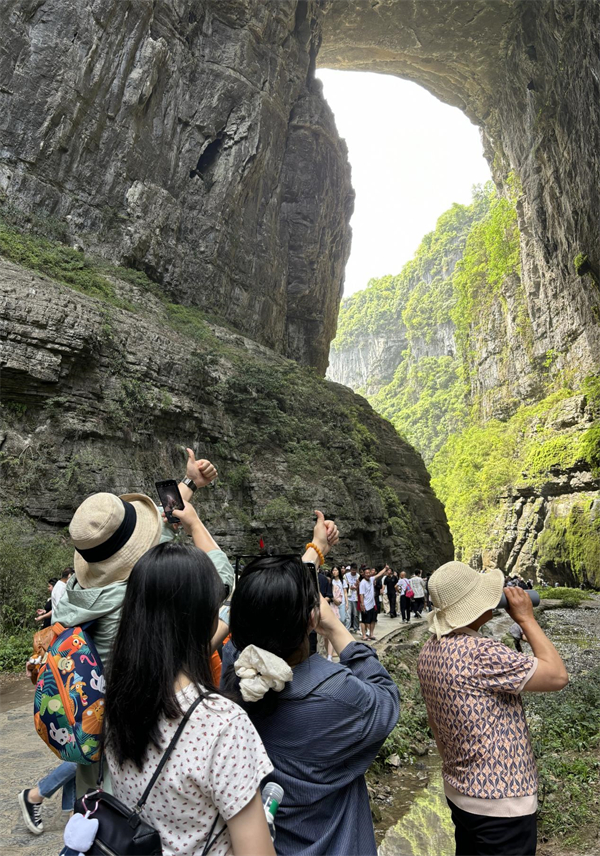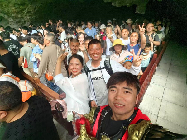 侠女侠客陪游团更是人气王,一袭白衣青衫的“江湖儿女”带着游客穿溶洞、跨石桥,用生动有趣地讲解把地质奇观讲成“武侠片场”,沿途不断有游客加入队伍,浩浩荡荡的“江湖团”在天龙桥、天福官驿、青龙桥间蜿蜒,场面堪比大片取景!