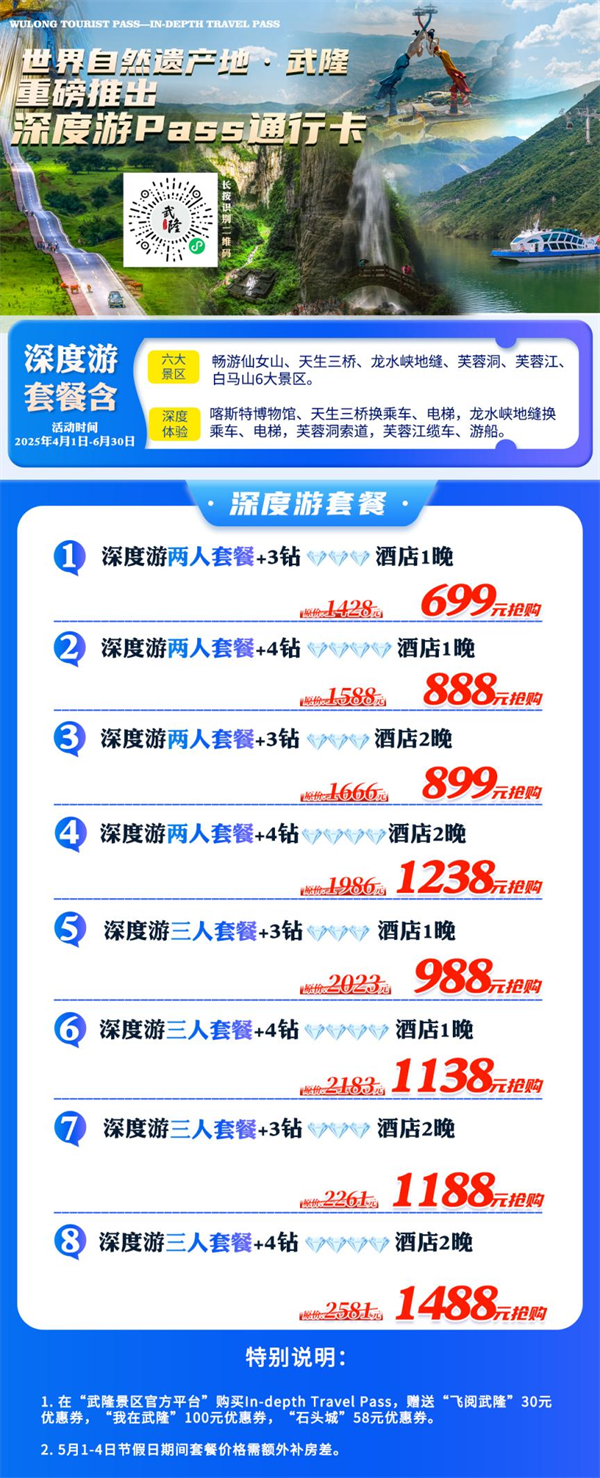 除情侣专属的Couple Pass外,武隆景区还为不同游客群体准备了惊喜。深度游Pass、大学生周末Pass、初夏Pass等都可承包你们整个初夏的清凉玩法。无论是情侣、挚友还是家人,都能在武隆的山水诗篇中找到属于自己的浪漫章节。