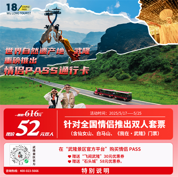 2025年5月17日至25日,武隆景区限时推出「Couple Pass - 情侣Pass卡」!仅需52元,就能享受价值616元的双人套票 ,转发武隆澳网官方网站Pass卡相关信息到朋友圈即可解锁。微信搜索“武隆景区官方平台”小程序购票,还有惊喜优惠券赠送哦!