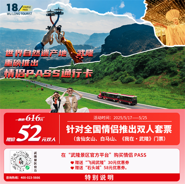 2025年5月17日至25日,情侣Pass甜蜜上线!仅需52元,抱走价值616元双人套票!仙女山草原手牵手追日落、白马山云雾里说情话、《我在武隆》奇幻演出见证誓言,还有惊喜优惠券等隐藏福利!这个“520”,和Ta在世界自然遗产地武隆立下爱情flag,这波仪式感直接拉满!