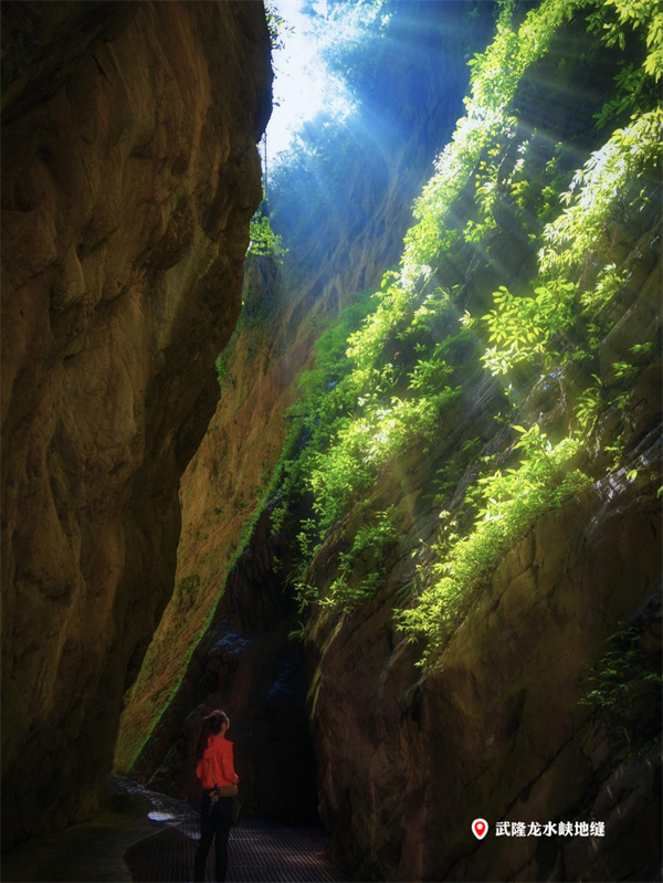 龙水峡地缝中,飞瀑流泉穿梭于幽深峡谷,清凉的水雾扑面而来,带来丝丝沁爽,抬头仰望,一线天光洒落,与脚下潺潺溪流相映成趣。