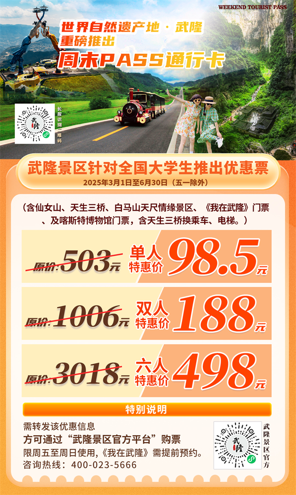 6月30日前,多重pass卡开启畅游模式,59.9元初夏pass卡解锁21℃清凉、大学生周末pass卡火车直达展开2天1夜短途奇遇、深度游Pass卡躺平式玩转武隆喀斯特秘境。