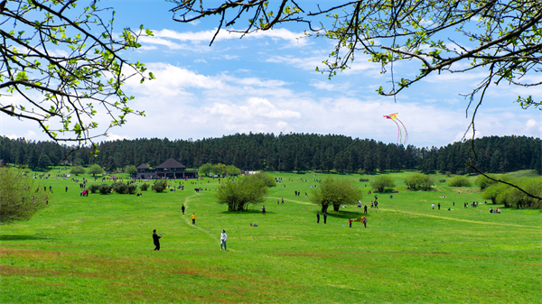 十万亩草场绿意葱茏,孩子们可以尽情奔跑放风筝、逗羊驼小羊,坐上复古小火车,穿梭如画美景。树顶漫步秒变森林游乐场,亲子时光快乐拉满!
