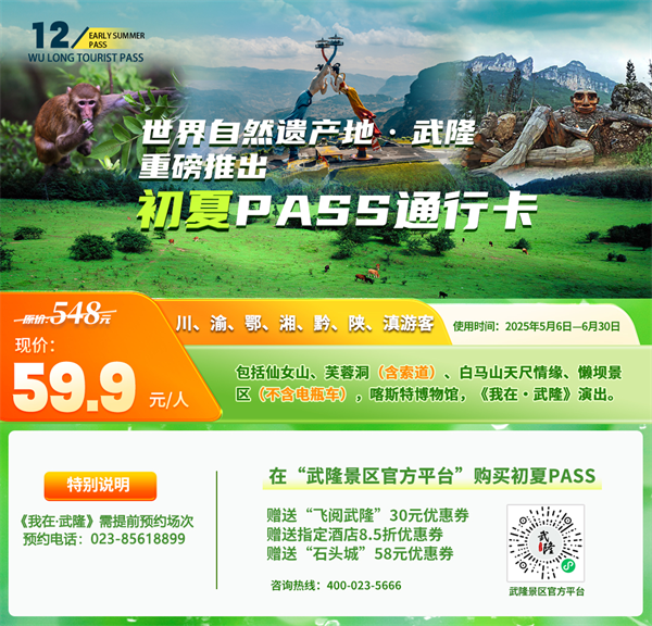 距离端午假期仅剩1天 啦!今年小长假有点特别 —— 当传统端午与童真六一 “梦幻联动”,粽叶清香与棒棒糖甜意交织,注定是个充满欢乐与温情的初夏!带娃出游正当时!想抓住难得的亲子时光?这份 武隆亲子游宝藏清单 请收好,承包孩子的笑声与成长,快来看看哪个更合宝贝心意吧!
