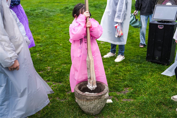 “咚!咚!”石臼边围满跃跃欲试的游客,木槌起落间糯米的清香弥漫开来。亲手捶打、揉捏,再趁热捏成软糯的糍粑团,蘸上红糖黄豆粉当场品尝,“自己打的糍粑就是香!”一位小朋友举着糍粑笑得满脸黏甜。这份亲手创造的美味,是带得走的节日祝福,更是看得见的文化传承。