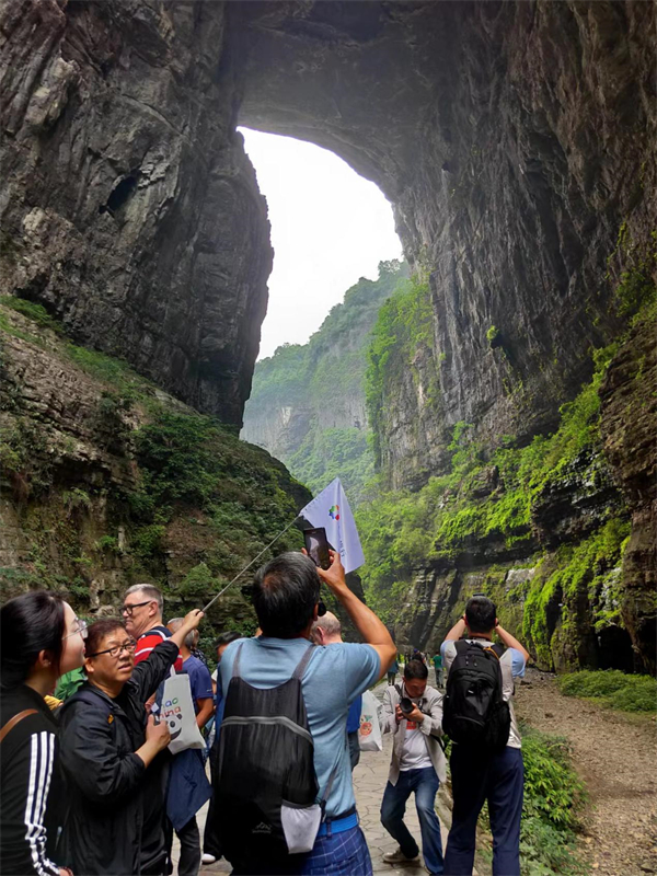 高考临近,众多游客慕名奔赴天生三桥“鲤鱼跃龙门”景点,游客们立于巍峨天坑之下,仰望自然鬼斧神工,为家人朋友默默祈愿好运加持,前程似锦!