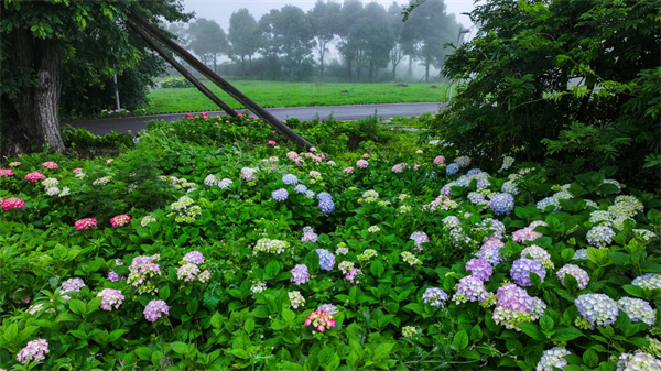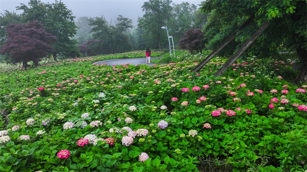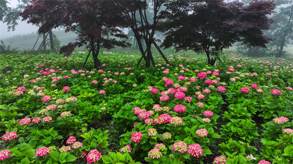 进入6月,重庆武隆懒坝国际禅境艺术度假区迎来年度景观盛宴,上万株绣球花在苔藓馆周边绽放粉蓝紫白交织的花海,与大地艺术装置“心跳博物馆”“竹音剧院”等形成独特的艺术景观矩阵,云雾缭绕间,宛如自然与人文共舞的立体画卷,吸引众多游客及摄影爱好者前往打卡,成为重庆初夏最具辨识度的文艺地标。