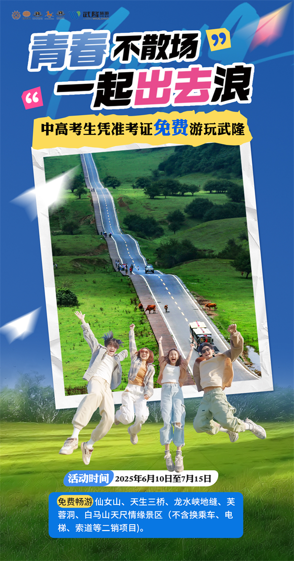 重点来啦!2025年6月10日至7月15日期间,只要你手持本人有效身份证件和中 / 高考准考证,就能免武隆五大核心景区门票!没错,仙女山、天生三桥、龙水峡地缝、芙蓉洞、白马山天尺情缘景区,统统免费进!(不含换乘车、电梯、索道等景区二销项目)让你可以毫无负担地畅游美景用最少的花费,收获最难忘的青春回忆。