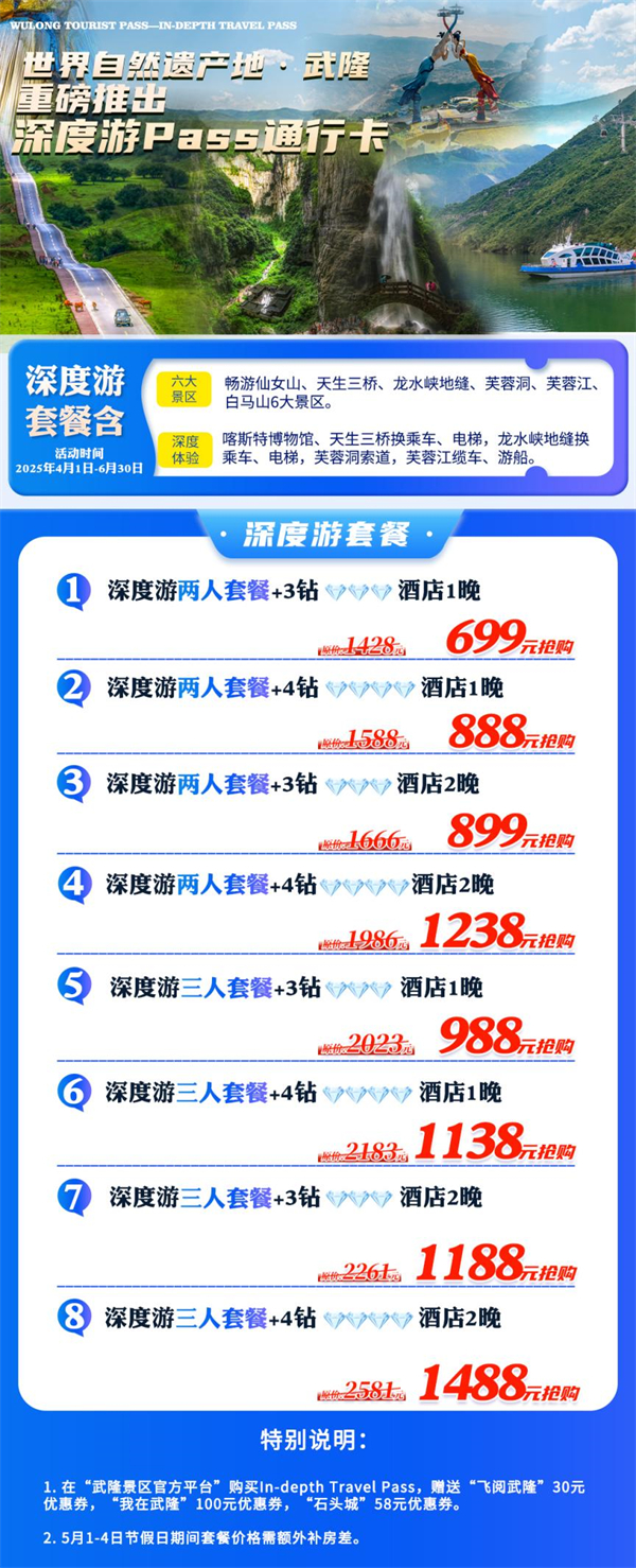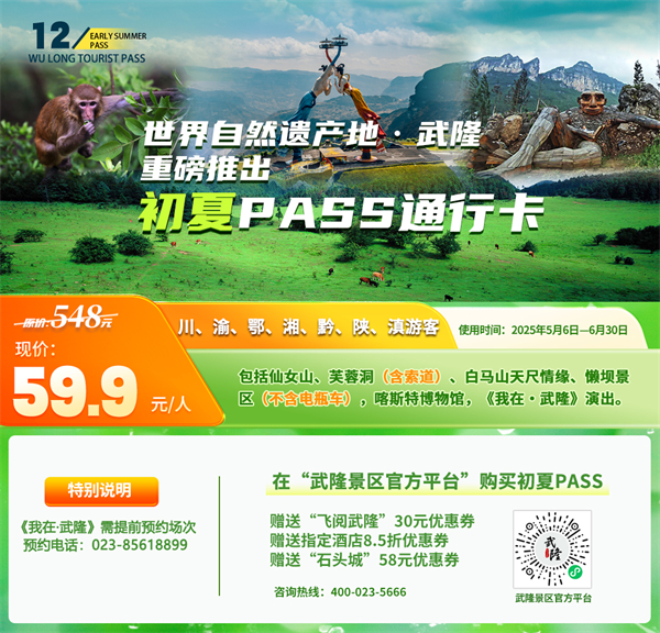 重点来了!武隆为大家准备了超多优惠套餐,初夏PASS、深度游PASS、大学生周末PASS,让你用超划算的价格,开启武隆之旅,尽情享受夏日清凉。值得注意的是,以上PASS卡活动时间至2025年6月30日截止,快抓住这波福利的尾巴吧!