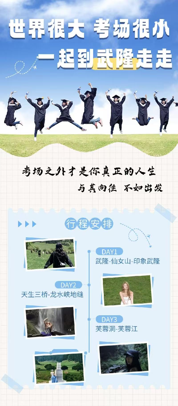 “人生录取通知书”不该只有A4纸的厚度,还有片山水在等你“录取”。武隆为中高考毕业生、大学生等人群量身定制的多款Pass卡福利进入倒计时!这可不是普通的景区优惠,是比志愿填报更该的“抢投档”。当毕业旅行成为“青春必考题”,武隆给出标准答案!