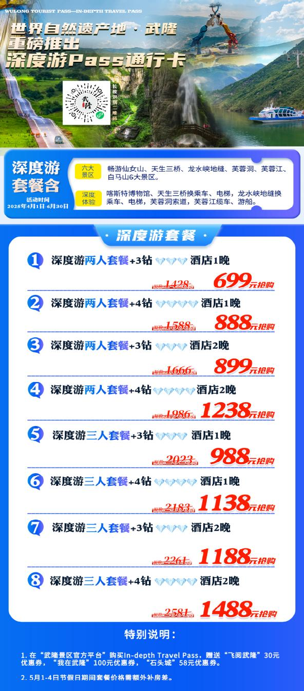 若想与家人或挚友共赴一场深度告白,深度游Pass将武隆的灵魂打包相送:住进3钻酒店枕山而眠,乘索道俯瞰芙蓉洞的光影秘境,在喀斯特博物馆读懂亿万年的地球故事。这趟旅程,会成为未来十年你们反复提起的“当年勇”。