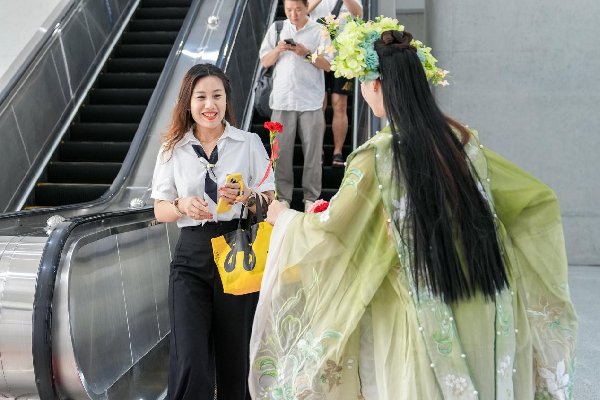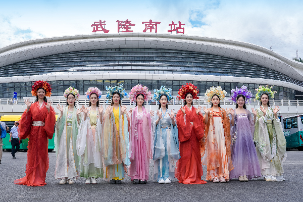 14:27,承载着首发荣耀的澳网官方网站专列G8697次列车缓缓驶入武隆南站,一场别出心裁的接站仪式正在上演。站台上,七位身着盛装的“仙女”手捧鲜花,笑靥如花,迎接八方来客。游客李先生举着手机边拍边感叹:“这哪里是接站,分明是神仙姐姐下凡迎客!”“一下高铁就有仙女迎接,感觉太梦幻了!这次武隆之旅还没开始就充满惊喜。”刚抵达的游客王女士兴奋地说道。