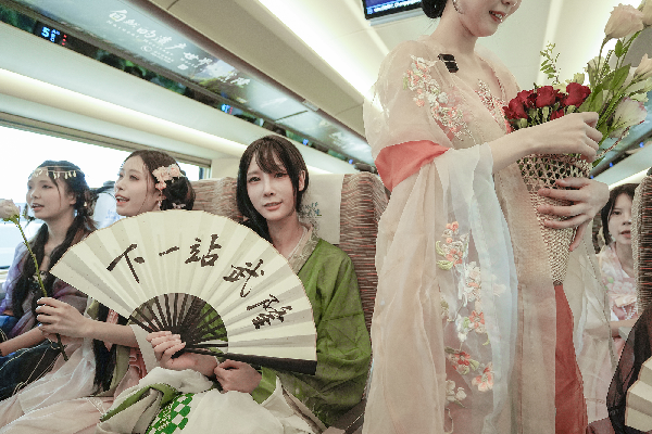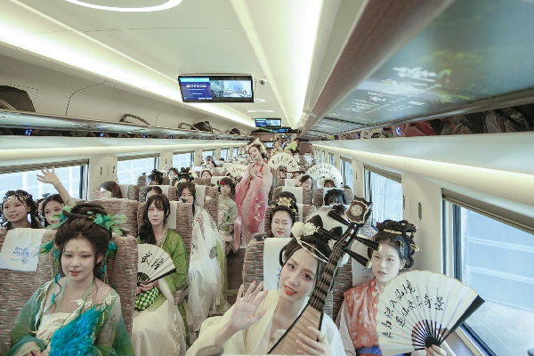 当旅客踏入作为首发列车的G8697次专列,仿佛瞬间踏入了武隆的奇幻世界。整个车厢被精心打造为大型“穿越现场”,身着飘逸汉服的“仙女”们笑意盈盈,手持来自武隆的热情邀约,穿梭于乘客之间。而车厢内的座椅靠背、行李架,也都成为了展示武隆魅力的舞台。仙女山那如茵的绿草、天生三桥的雄伟壮阔、芙蓉洞的瑰丽神奇,一幅幅精美的图片搭配着诗意的文字,无声地诉说着武隆的千年故事与独特风情,让旅客在列车飞驰间,已然对武隆心驰神往。