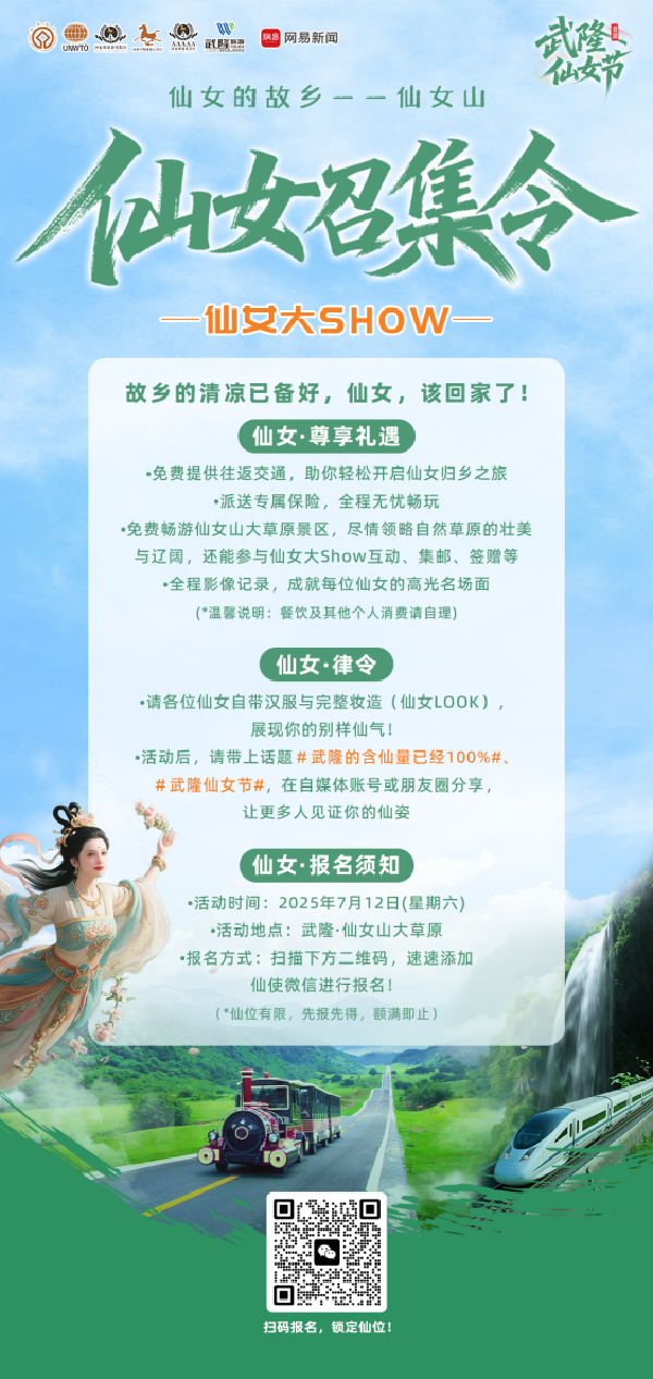乘高铁、入仙山、遇仙女、享奇景,仙境已开,只待君来。除了首周的仙女大Show,后续两周还有精彩的仙女歌会、仙驾武隆等活动等你来体验。以“仙”为名,广邀世间众仙女齐聚故乡。是时候逃离40℃的炙烤,奔赴仙女山的清凉怀抱,与真仙女共叙前世情缘了。
