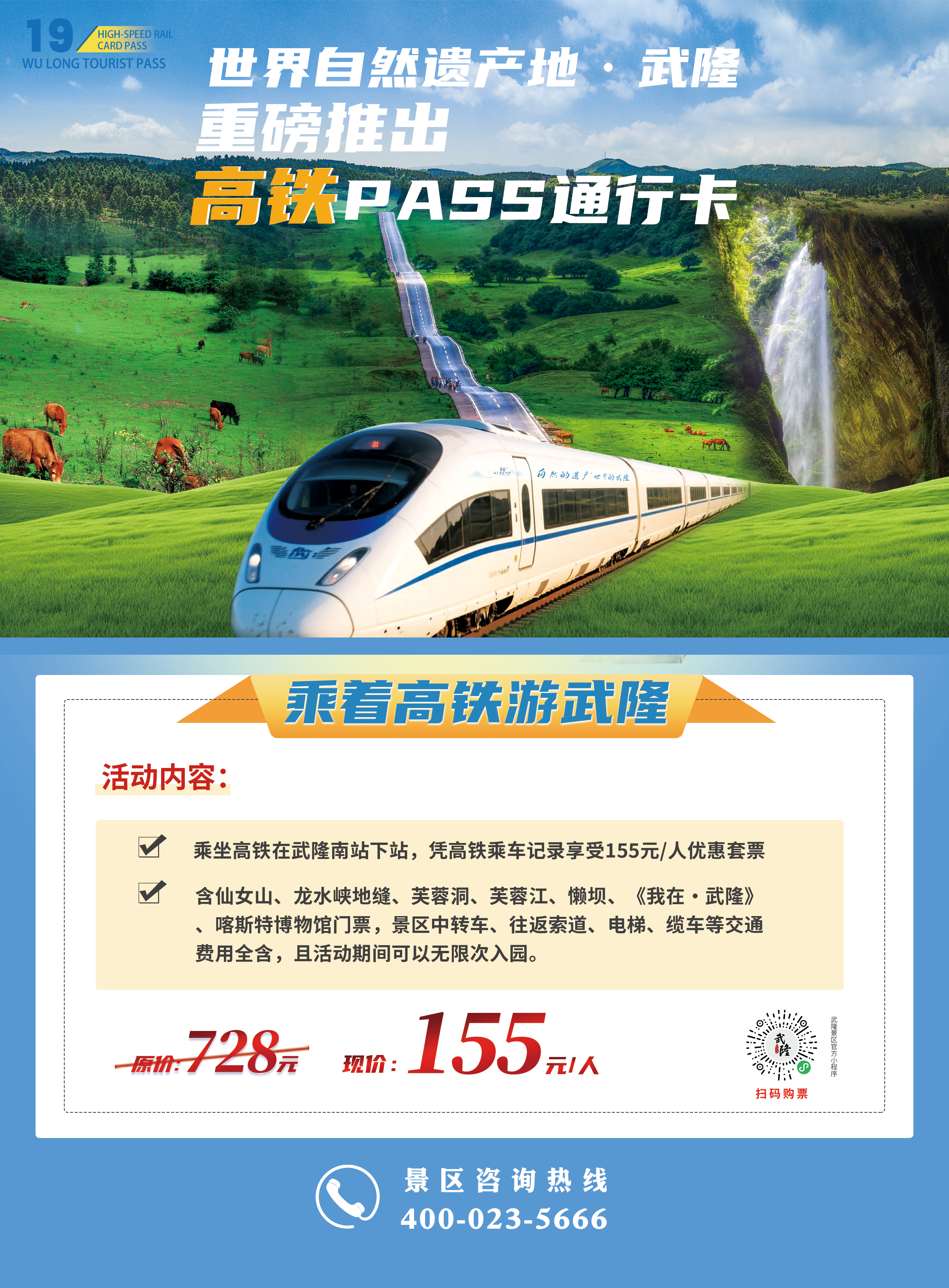 为庆祝高铁开通,武隆景区诚意献礼:高铁开通至年底,凭抵达武隆南站的高铁票,即可购买155元高铁畅游PASS(原价728元)!一票畅游仙女山、龙水峡地缝、芙蓉洞等五大核心景区,让诗与远方不再遥远。