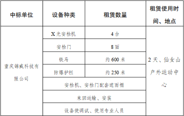 我司于2025年8月1日通过武隆澳网官方网站官方网站发布《2025仙游音乐节安保设备租赁招标公告》,并于2025年8月5日14:30组织召开了现场比选谈判会。在过程中严格按照比选流程及评审进行,现将比选结果公示如下:
