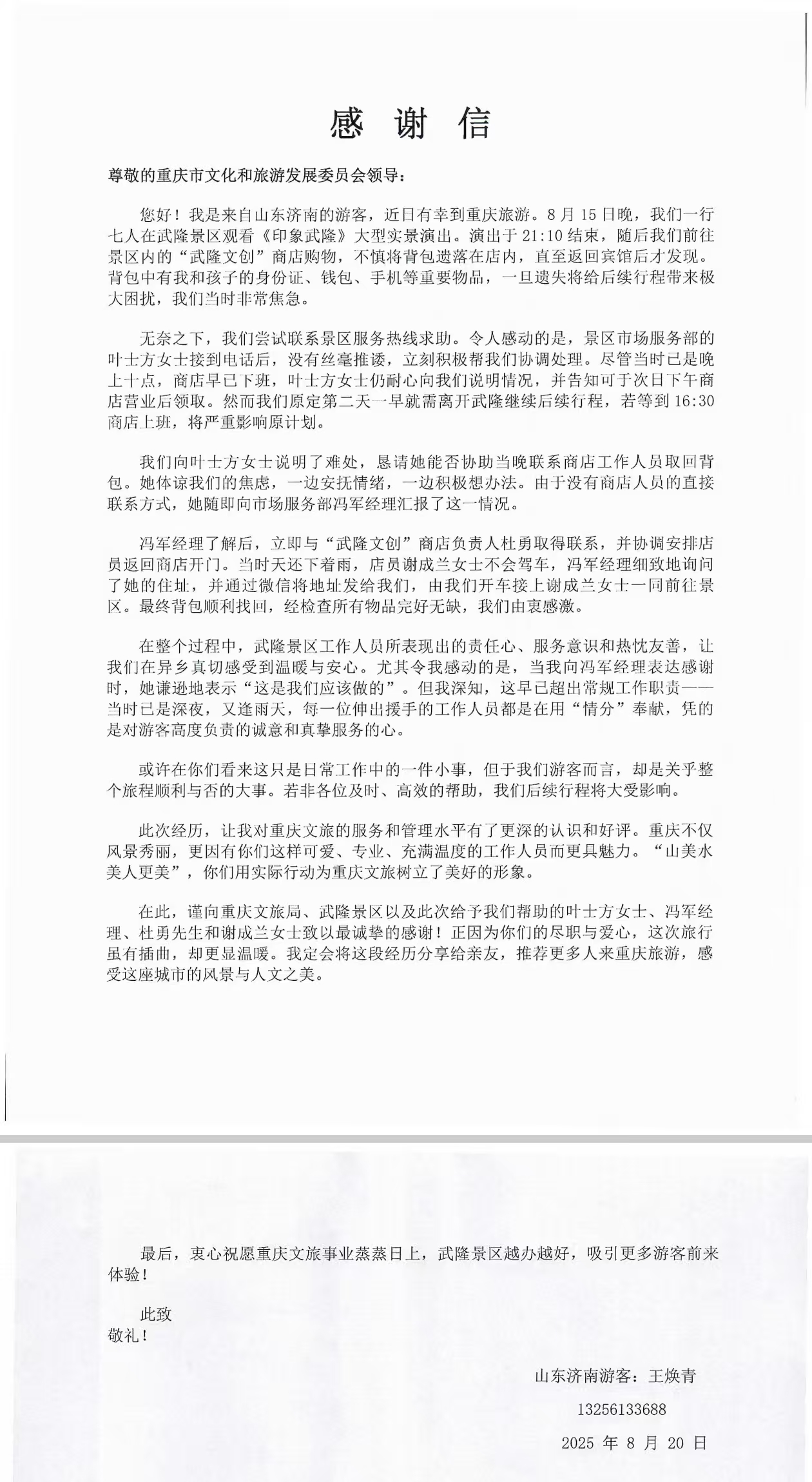 王女士深受感动,返鲁后专门向重庆市文旅委发去感谢信,表扬武隆景区“服务暖心、负责到底”。