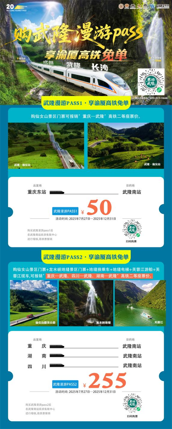 “仙女体验卡”福利解锁:购买漫游PASS2“仙女山+龙水峡地缝+芙蓉江”套票,可报销川渝湘至武隆的高铁票!购买漫游PASS1“仙女山”门票,即可报销"重庆-武隆"段高铁票。仿佛拿到童话世界的通关文牒~