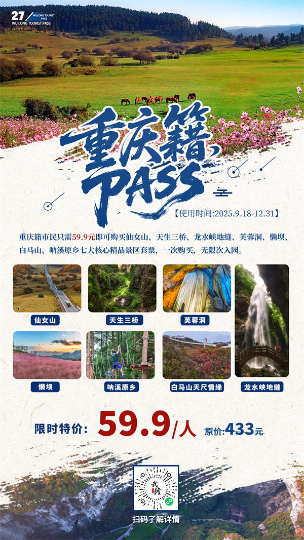 59.9元重庆籍Pass直接把七大景区套票(仙女山、天生三桥、龙水峡地缝、芙蓉洞、懒坝、白马山、呐溪原乡)打包到年底,平均一个景点不到10块钱~