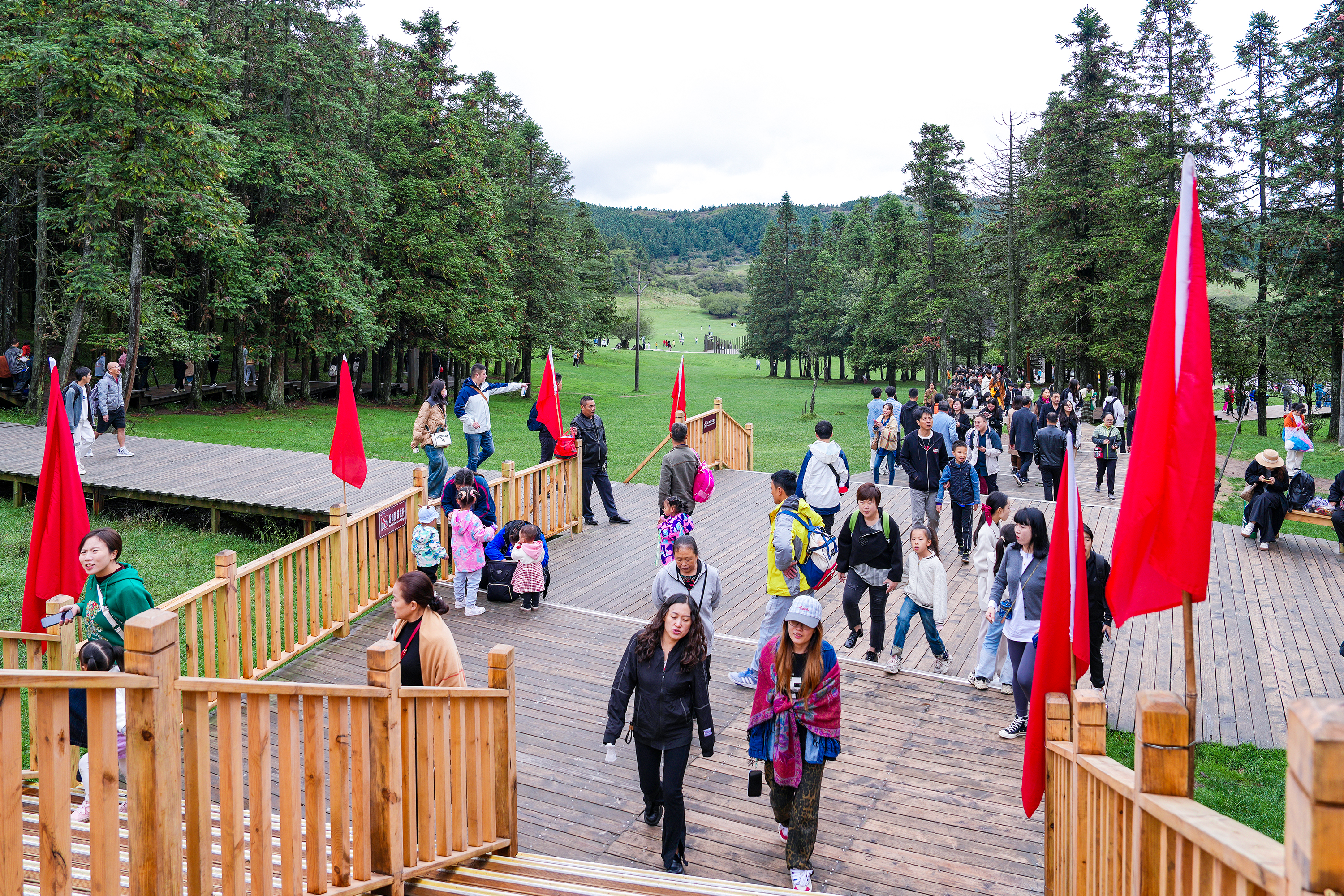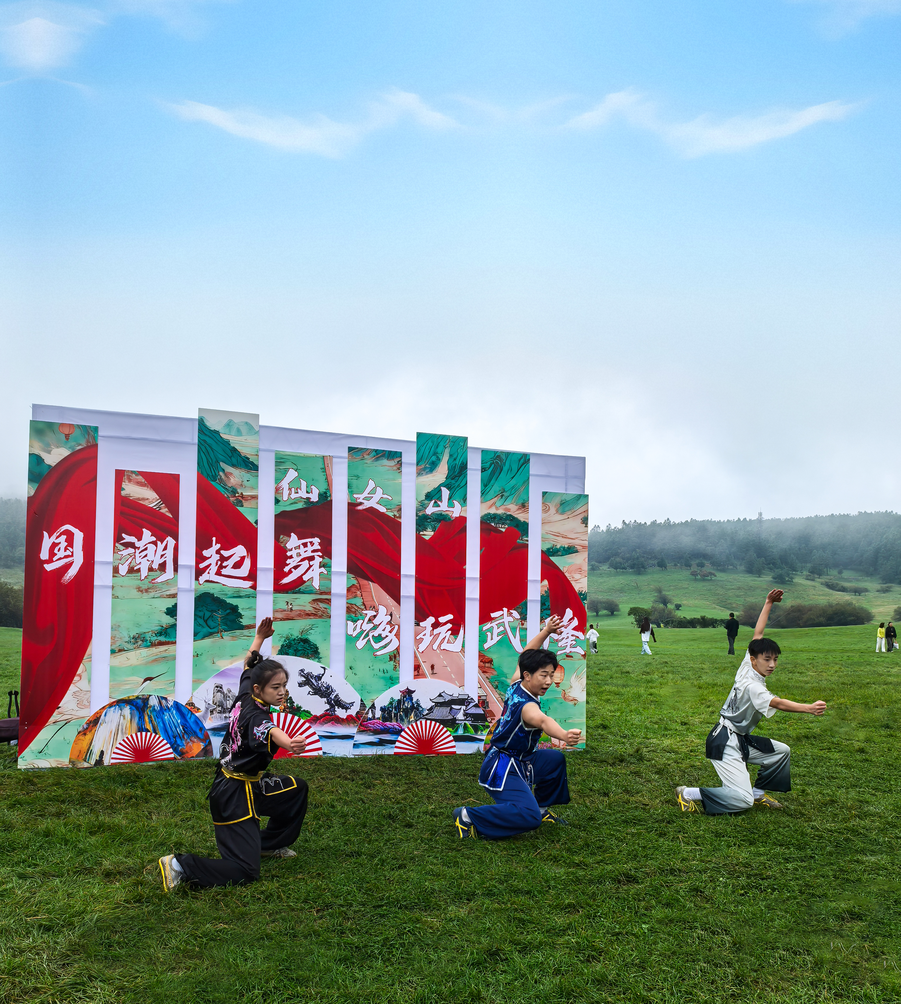五大国潮活动成 “人气磁场”:仙女山景区,《丽人行》舞者刚谢幕,工作人员便摆出装满小国旗、“爱心” 贴纸、国旗发夹的礼品桌,孩子们围拢领取,成年人举旗与舞者同框,红旗下,草甸金黄与舞者朱红裙摆相映成趣。