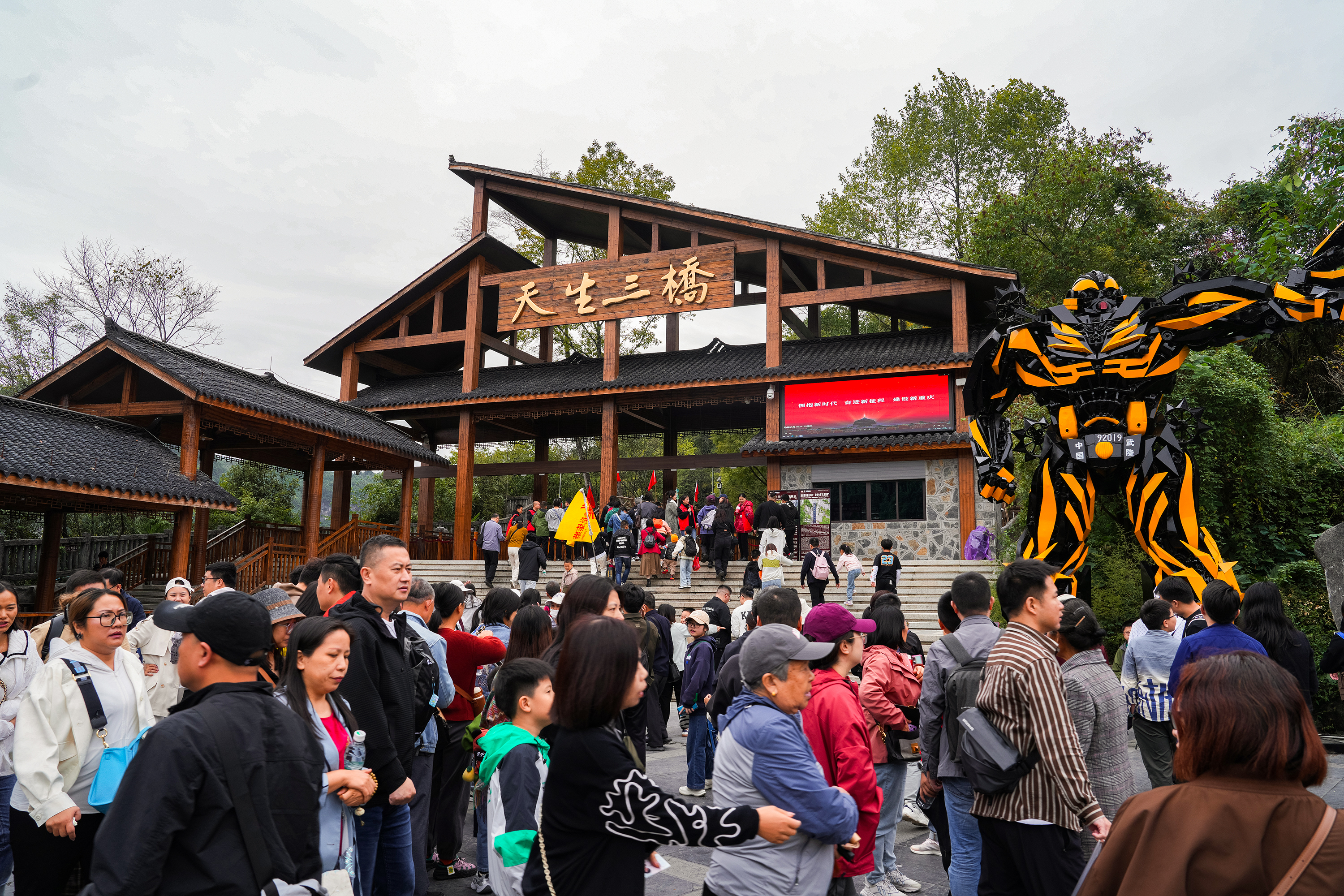 国庆第二天,武隆景区燃爆了!仙女山、天生三桥等核心区域人潮川流不息,但步履从容,瞬间点燃黄金周热度巅峰。