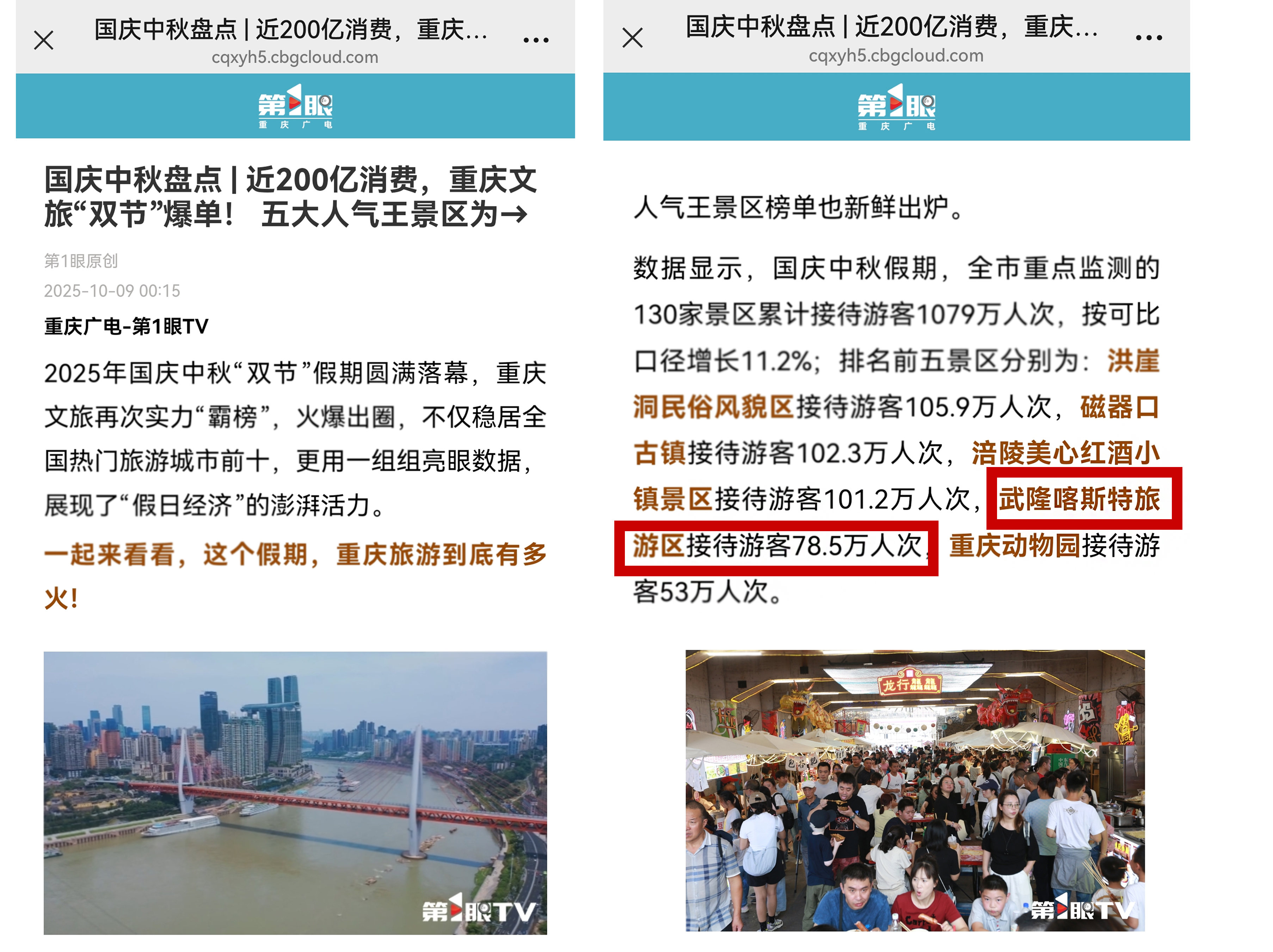 此次双节假期,武隆景区以文化为魂、山水为基、服务为翼,成功打造了 “可观、可感、可参与” 的文旅 IP。下一步,景区将持续深化 “国潮 + 生态” 融合发展,优化交通接驳与产品供给,让世界自然遗产地绽放更持久的文旅魅力。