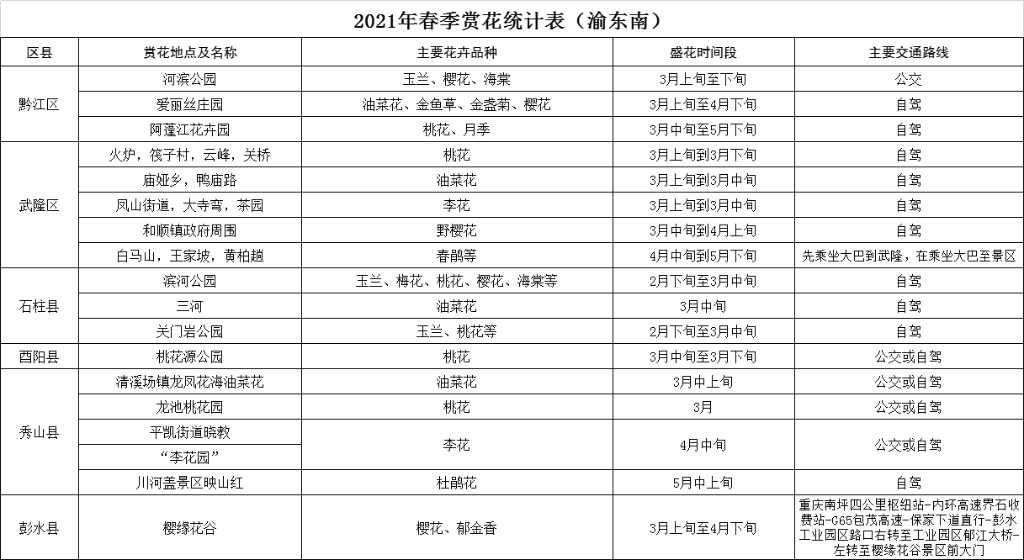 经统计,全市41个区县共有近300处有一定赏花规模、观花效果佳的地点和干道。主要涵盖我市城市公园、社区公园(游园)、广场、城市干道、节点和各区县花卉苗木产业基地和农作物基地等。花卉品种集中在玉兰、山茶花、海棠、美人梅、樱花、郁金香、红叶李、梨花、李花、桃花、牡丹、芍药以及油菜花等植物,开花时间在2月中下旬至5月期间。
