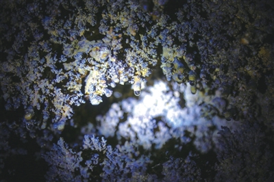 记者发现,溶洞洞壁上布满水珠,手摸上去感觉水珠黏稠滑溜。