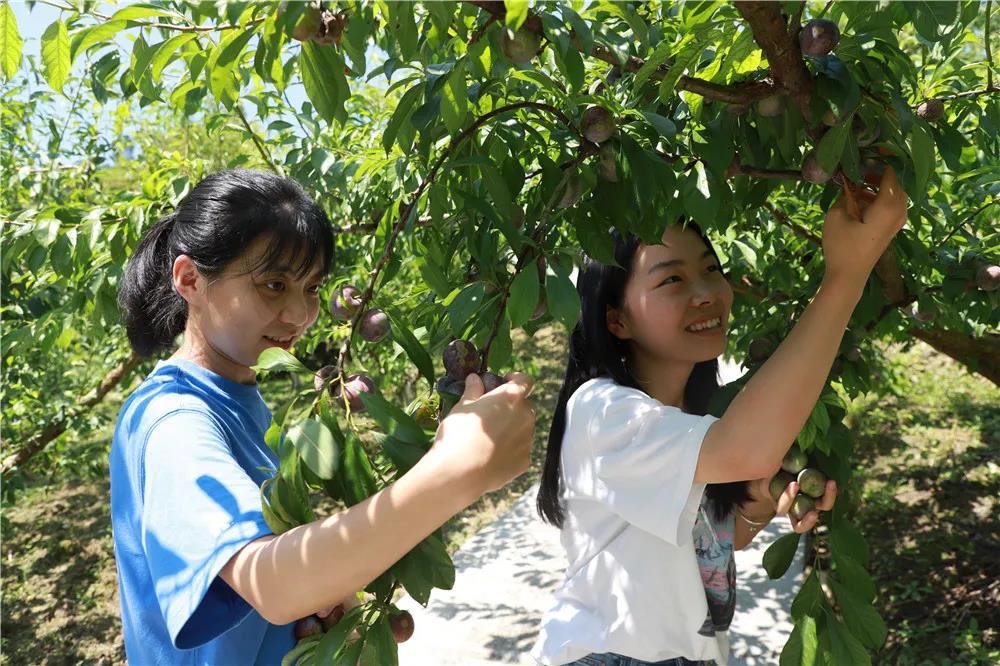 成熟的脆红李颜色鲜艳,个头圆润,果皮表面还带着薄薄的果霜,看上去非常诱人。不少游客也闻香而来,穿梭在果林中,或采摘、或品尝、或拍照,尽情体验生态采摘带来的乐趣。