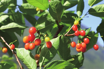 走进羊角街道关滩果园,成片的樱桃林遍布山坡。在低矮的樱桃树上,一串串晶莹剔透的樱桃掩映在绿叶当中,有的黄中带红,有的完全红透,果实饱满诱人,阵阵山风迎面吹来,果香扑鼻,令人垂涎欲滴,在阳光的照射下,显得更加娇艳欲滴,惹人喜爱。