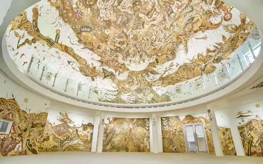 1.2 通过收集武隆当地泥土,利用晒干、碾碎、调制等一系列的方式,将泥土“变身”为各色颜料,并在苔藓博物馆的穹顶上绘制大型壁画,令人震撼不已。