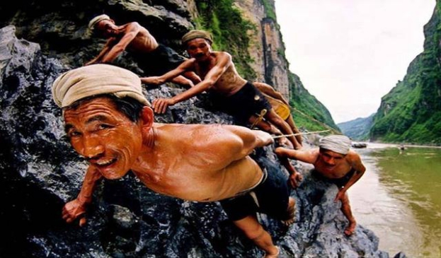 当货船起坎上岸后,纤夫拉船靠的是精诚合作的气势,人在悬崖每走一步都需要付出巨大的力气。流淌的江水非常急,只见纤夫们手扒乱石脚蹬沙,目光如炬,热血喷张,青筋暴出,把恶浪强压。“嗨呀做,嗨呀做——”涛声如雷,却抵不过纤夫们雄浑的号子声。